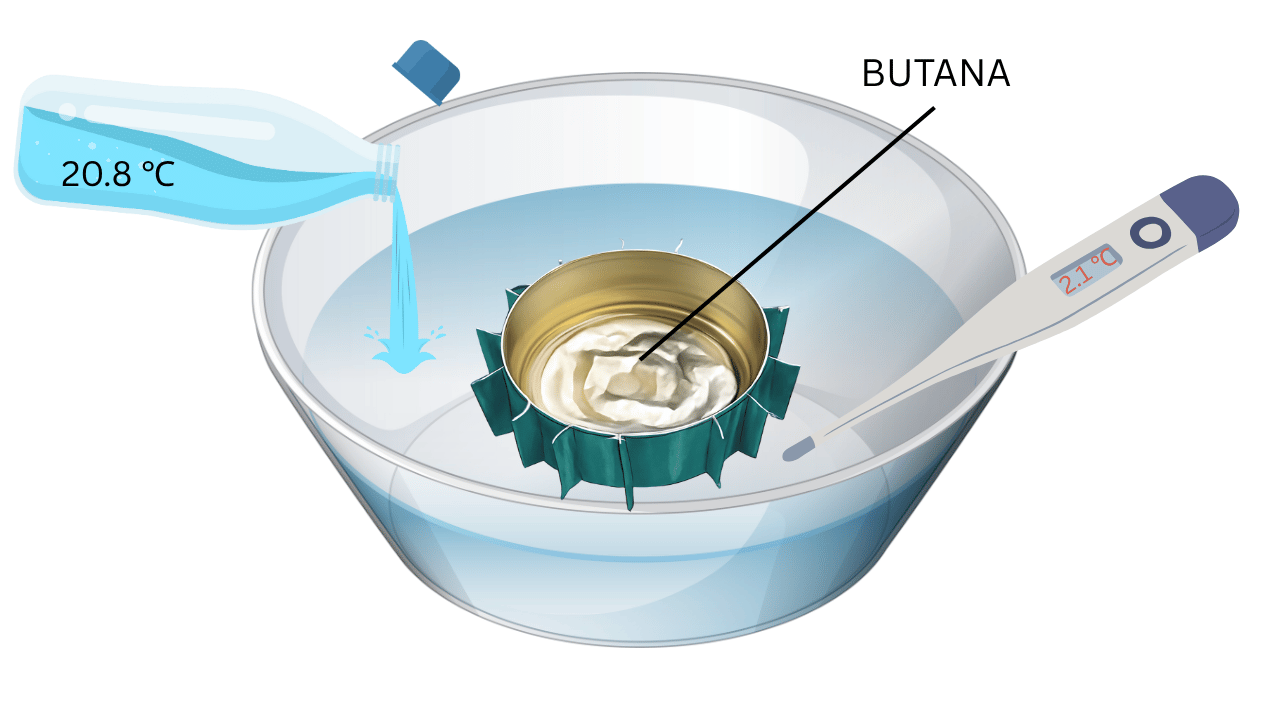 Saat butana menguap, ia menyerap panas dari air di sekitarnya sehingga suhu air turun drastis, dari sekitar 20.8°C menjadi 2.1°C.