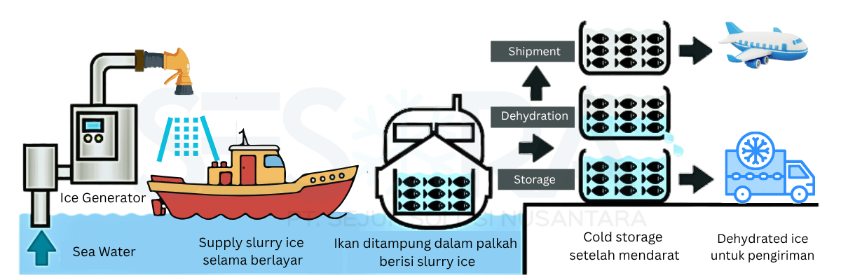 Sebagai solusi, kini diperkenalkan teknologi slurry ice — atau es cair — yang mampu mendinginkan ikan lebih cepat dan merata.